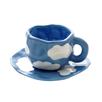 UCHOME เหยือกสีฟ้าเมฆขาว,มือหยิกไม่สม่ำเสมอสีกาแฟและจานรอง